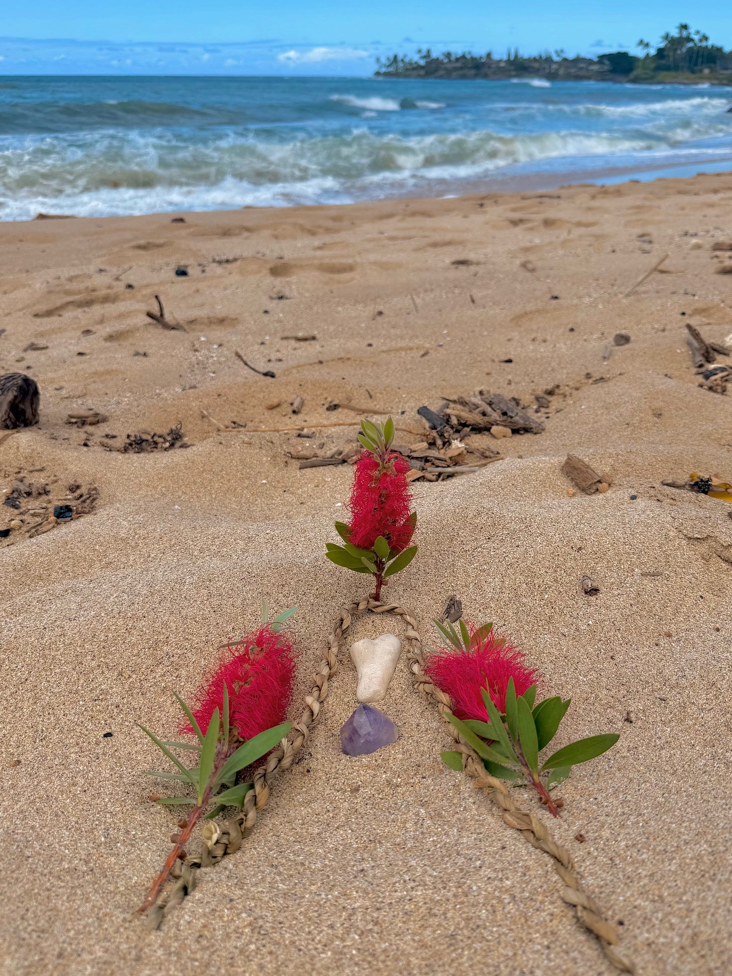 Two weeks ago, on the two-year anniversary of my attack, I went down to Tavares Bay—the place it happened. I set up a small altar: a ti leaf lei, which in Hawaiian culture symbolizes protection, good luck, strength, and healing; a heart-shaped piece of coral; an amethyst crystal for clarity and protection; and three ʻōhiʻa lehua blossoms—one for me, one for my shark, and one for our infinite bond. The ʻōhiʻa lehua symbolizes strength and resilience. After everything I’ve done to heal these past two years, I’ll gladly claim both virtues.